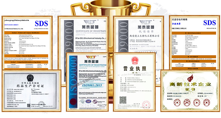 Xi'an Deli Biochemical Industry Co., Ltd. onkorkean teknologian yritys, joka on erikoistunut syklodekstriinin ja sen johdannaisten tutkimukseen ja kehitykseen, tuotantoon ja myyntiin. Perustamisestaan 27. elokuuta 1999 lähtien yritys on noudattanut laatupolitiikkaa "keskittyy lisävarusteisiin, laatu ensimmäinen, vilpitön palvelu, pyrkimys ensiluokkaiseen". Yli 20 vuoden kovan työn ja kehityksen jälkeen yrityksellä on tällä hetkellä tuotteita DELI Brand Hydroxypropyl Betadex, DELI Brand Betadex Sulfobutyl Ether Nadium. Yllä olevat tuotteet on rekisteröity ja rekisteröity FDA:lle.