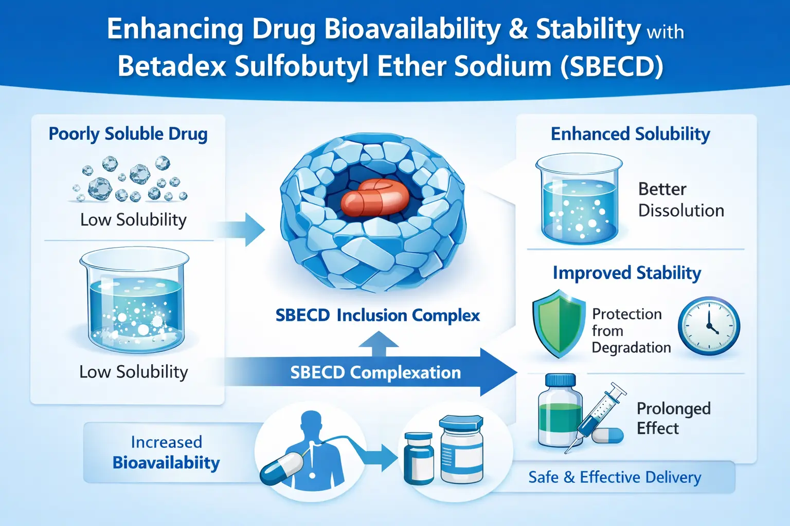 SBECD:n ainutlaatuinen kemiallinen rakenne auttaa sitä käsittelemään tätä ongelmaa. Syklodekstriinin runko tekee lääkemolekyyleille tilan, joka on hydrofobinen, ja sulfobutyylieetteriryhmät tekevät lääkkeen erittäin helposti liukenevan veteen. Koska SBECD:llä on kaksi ominaisuutta, se on loistava tapa toimittaa lääkkeitä.